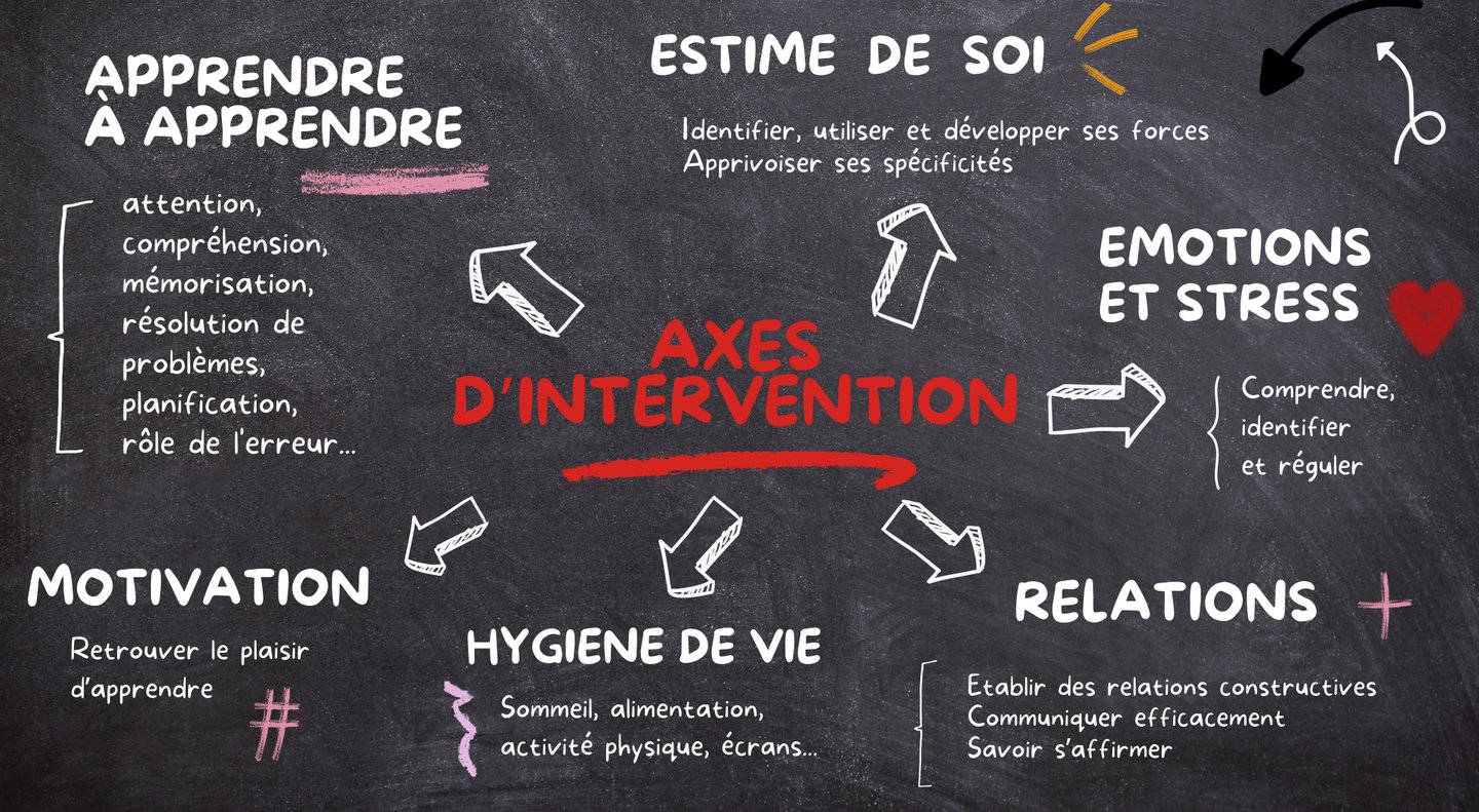 En aidant l'enfant dans la compréhension de son fonctionnement et le développement de stratégies personnelles, efficaces, durables et transférables, l'objectif de l'accompagnement dépasse la seule réussite scolaire pour la concilier avec l'épanouissement personnel et le développement de relations sociales équilibrées.